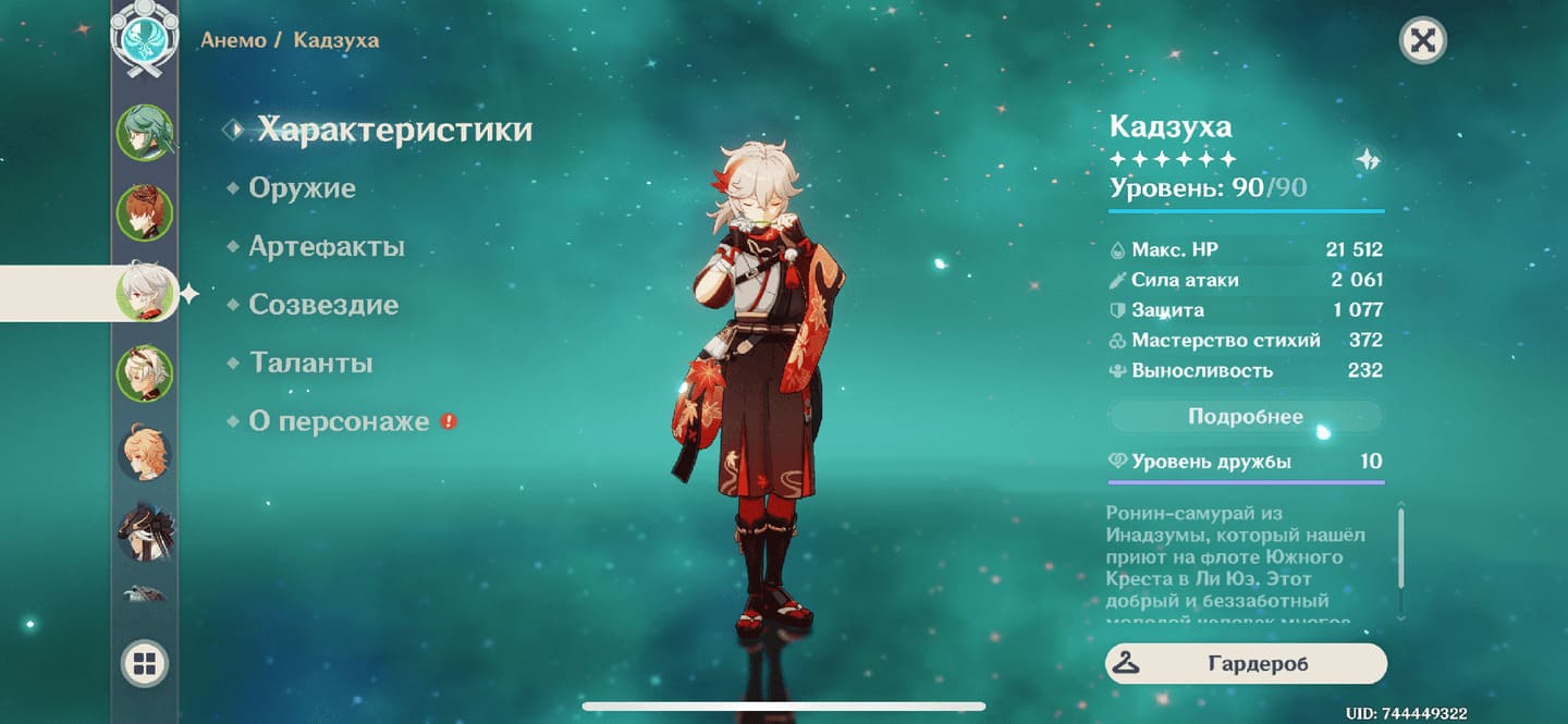 📈 Ранг: 58 🧍♀️ Персонажи: Аяка, Кадзуха, Сяо, Гань Юй, Чжун Ли, Венти, Мона, Дилюк, Ци Ци и другие ✨ Примогемы: 2100