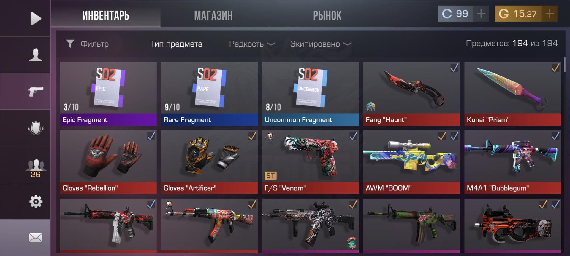 💰Голда: 15.27; 🧤Перчатки: 2 🔪Ножи: 2; ⭐️Редкие скины: 9